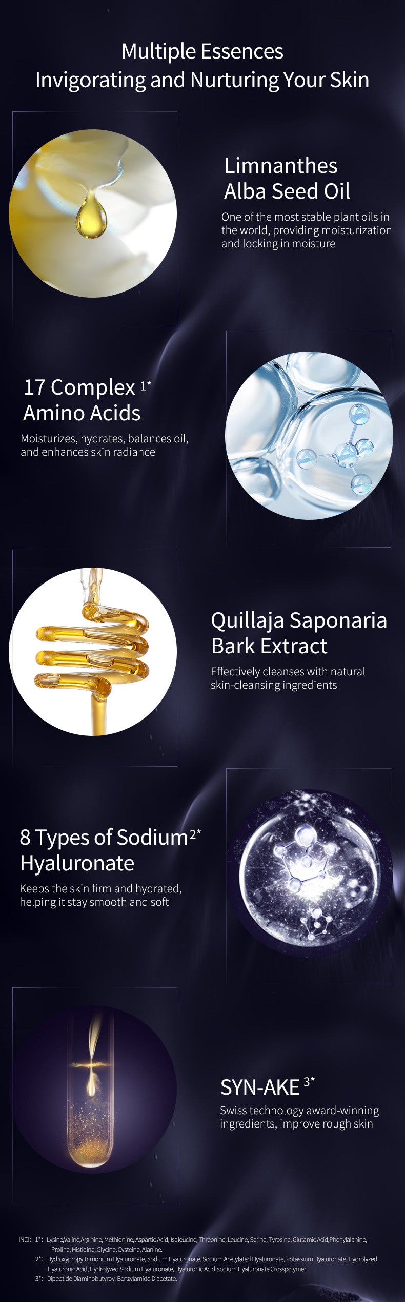 Water, Glycerin, Potassium Cocoyl Glycinate, Sodium Lauroamphoacetate, Citric Acid, Glyceryl Stearate Se, Pentylene Glycol, Glycol Distearate, Glycol Stearate, Sodium Chloride, Acrylates Copolymer, Coco-Glucoside, Fragrance, Limnanthes Alba (Meadowfoam) Seed Oil, Sodium Cocoyl Isethionate, 1,2-Hexanediol, Arginine, Quillaja Saponaria Bark Extract, Butylene Glycol, Glycine, Serine, Glutamic Acid, Sodium Hyaluronate, Aspartic Acid, Leucine, Dipeptide Diaminobutyroyl Benzylamide Diacetate, Alanine, Lysine, Tyrosine, Phenylalanine, Proline, Threonine, Valine, Isoleucine, Histidine, Cysteine, Methionine, Hydroxypropyltrimonium Hyaluronate, Hydrolyzed Hyaluronic Acid, Sodium Acetylated Hyaluronate, Hyaluronic Acid, Hydrolyzed Sodium Hyaluronate, Sodium Hyaluronate Crosspolymer, Potassium Hyaluronate.